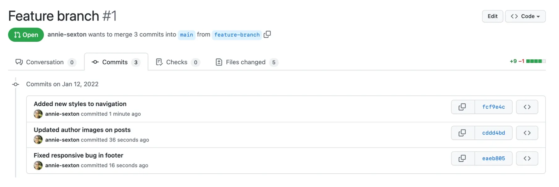 Once you've split your work into logically grouped commits, you're ready to create your pull request! The final result is a set of changes that your colleague can review one commit at a time in manageable chunks.
