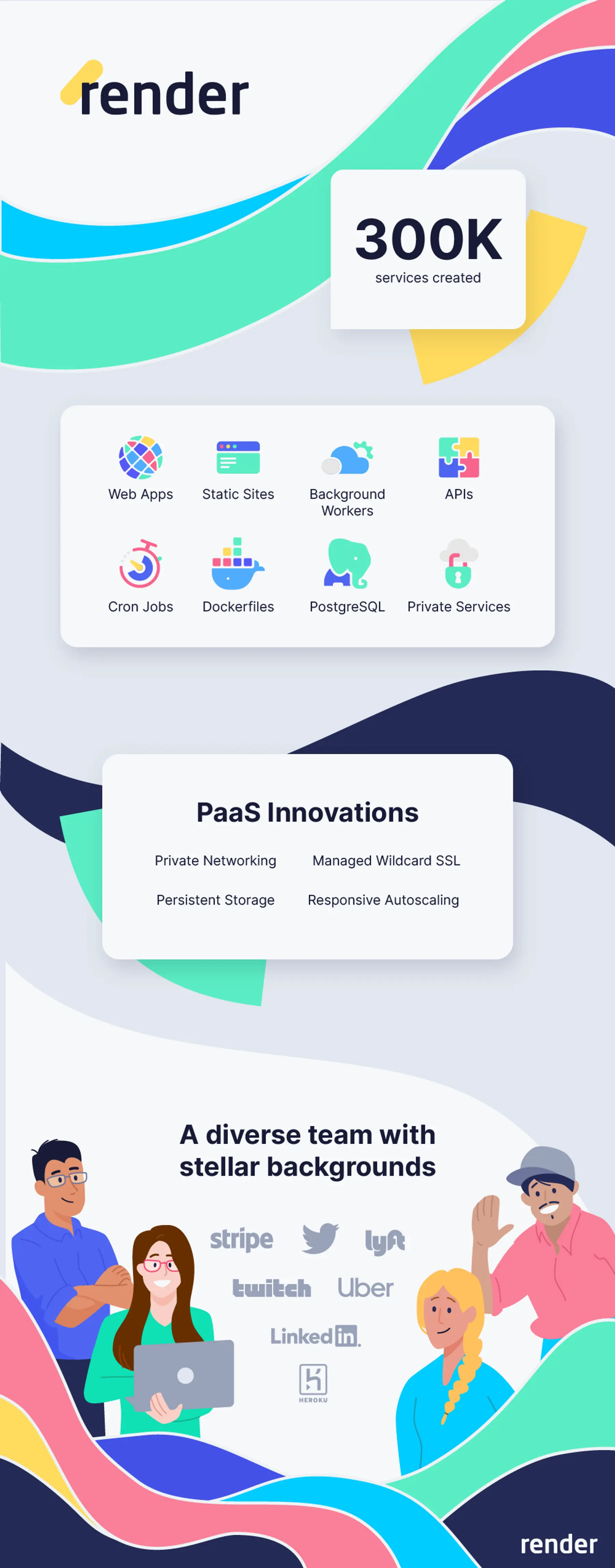Most importantly, Render has grown to include immensely talented, kind, and diverse humans with stellar backgrounds at companies like Stripe, Twitter, Uber, Lyft, Twitch, LinkedIn, and Heroku. We're always hiring!